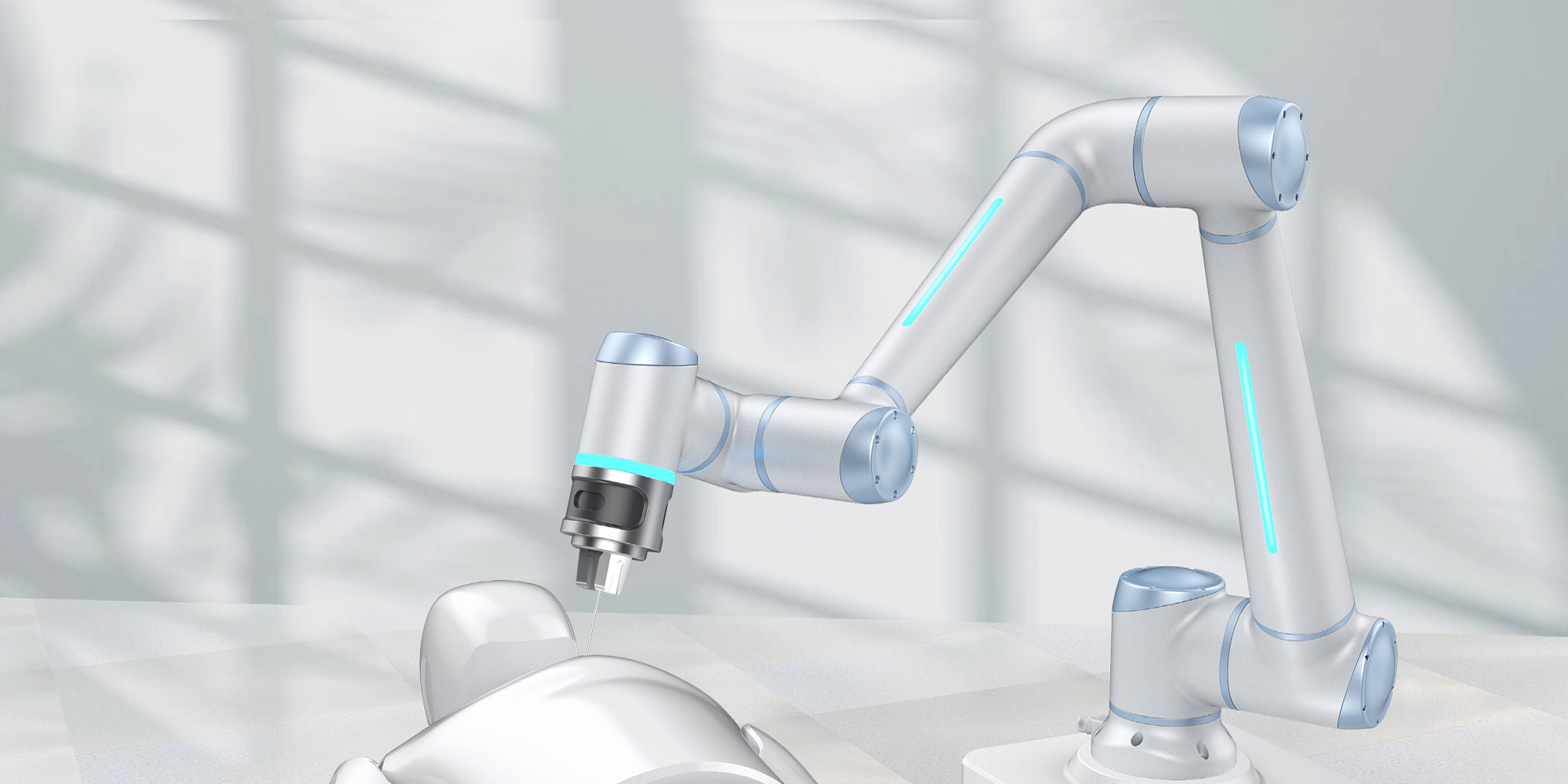 這款協作機器人的設計簡約大氣,流暢的線條凸顯產品的“精練”,提升產品的可靠性。淡雅的配色給人以親和的感覺,符合醫療器械安全干凈的特點。